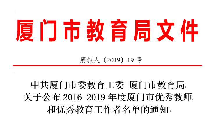 祝贺新葡的京官网教师获评2016-2019年度厦门市优秀教师和优秀教育工作者称号