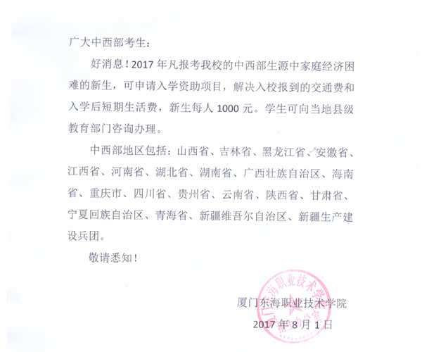 好消息!2017年凡报考新葡的京官网的中西部生源中家庭经济困难的新生,可申请入学资助项目,解决入校报到的交通费和入学后短期生活费,新生每人1000元。学生可向当地县级教育部门咨询办理。