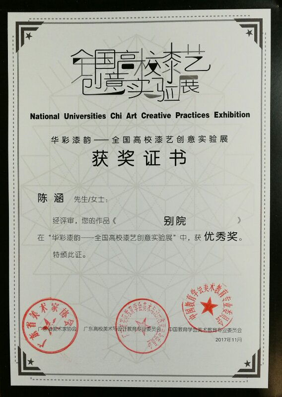 2017年11月,在由广东省美术家协会、广东高校美术与设计教育专业委员会、中国教育学会美术教育专业委员会联合主办的全国高校漆艺创意实验展—“华彩漆韵”展会中,新葡的京官网传媒艺术学院陈涵老师的作品《别院》在展会中得到评审一致认可,荣获优秀奖!