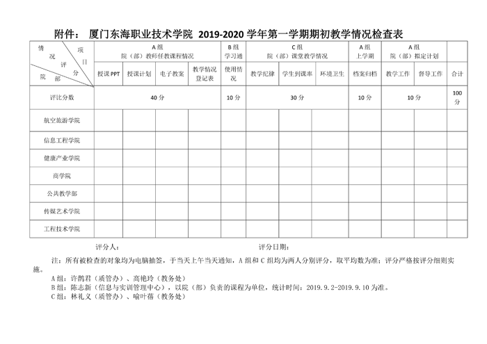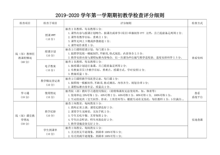 为加强教学质量监控,稳定教学秩序,提高教学质量,学校教学质量管理办公室根据《东海教字〔2019〕 012号关于开展2019-2020学年第一学期期初教学检查的通知》文件要求,做如下具体检查安排: