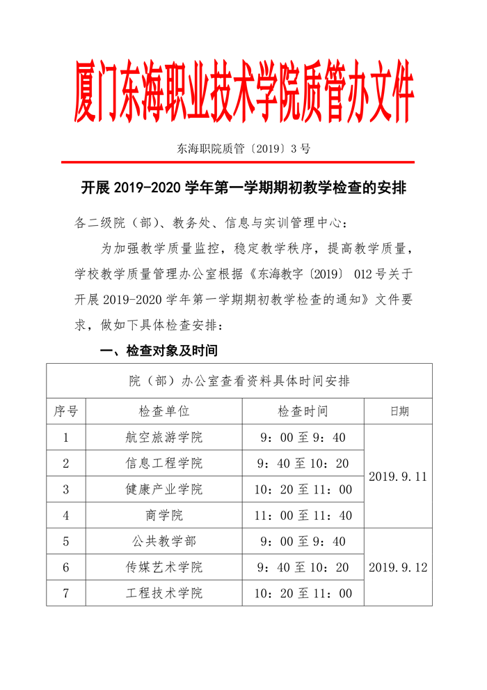 东海职院质管[2019]3号——开展2019-2020学年第一学期期初教学检查的安排