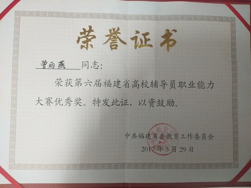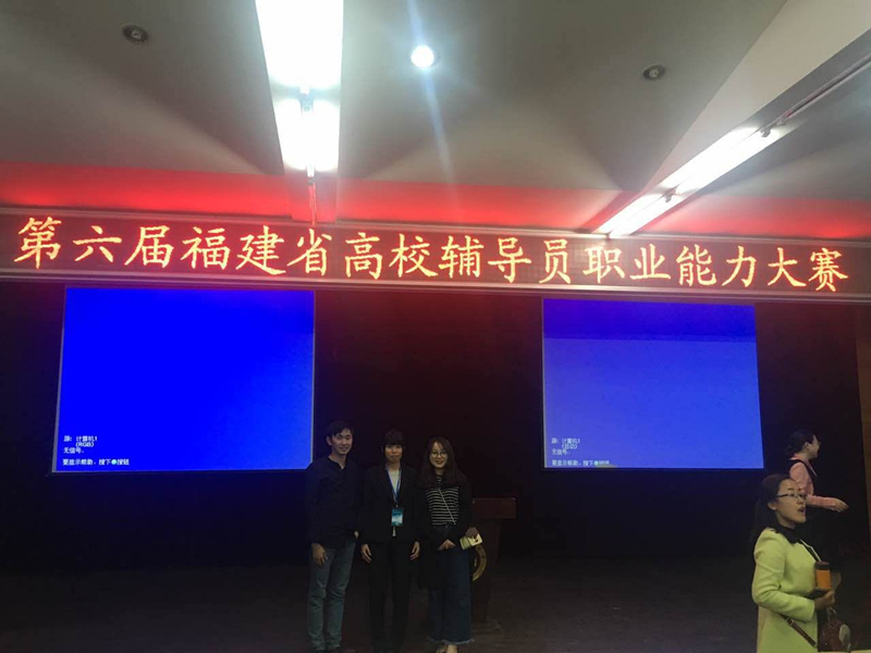 2017年3月28日省第六届辅导员职业能力大赛于福建师范大学旗山校区举行,此次比赛的参赛人员来自其他高校71位优秀辅导员。为了以赛代训、以赛代练,进一步推进辅导员队伍专业化、职业化建设,新葡的京官网通过多次筛选,推荐曾丽燕老师参加此次比赛,王巧明、唐东旭前往比赛现场观摩。经过激烈角逐,新葡的京官网曾丽燕老师获得“优秀奖”佳绩。