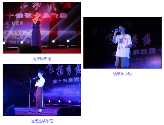 接下来,费晨曦在渐变的微光中演绎了一首《梦里花》,邱金梅和罗霞分别演绎了一首高难度的《你一定要幸福》和《我对自己开了一枪》;不同于前两首安静的歌曲,陈陆阳和王松石的《歌曲串烧》和《雨一直下》将晚会推向高潮。最后一位登场的陈田恬同学用美声演绎的《共和国之恋》,迎来阵阵叫好。最后往届十佳歌手陈珏的返场表演,用歌声和曼妙的舞姿呈现了一首别具风格的《流花》。