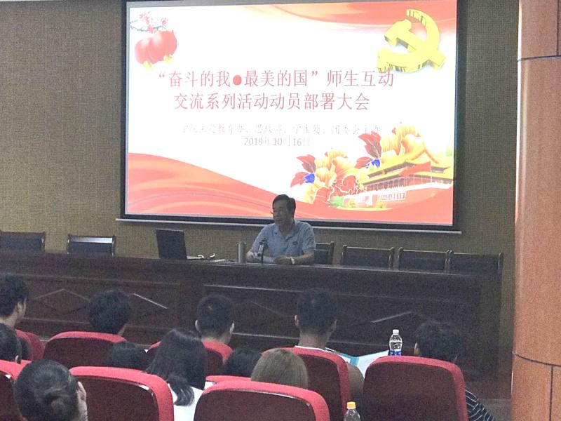 为扎实推进“不忘初心 牢记使命”主题教育活动深入开展,结合庆祝中华人民共和国成立70周年,大力弘扬以爱国主义为核心的伟大民族精神,新葡的京官网于10月16日下午在思源楼大报告厅举办以“奋斗的我·最美的国”为主题的师生互动交流系列活动。