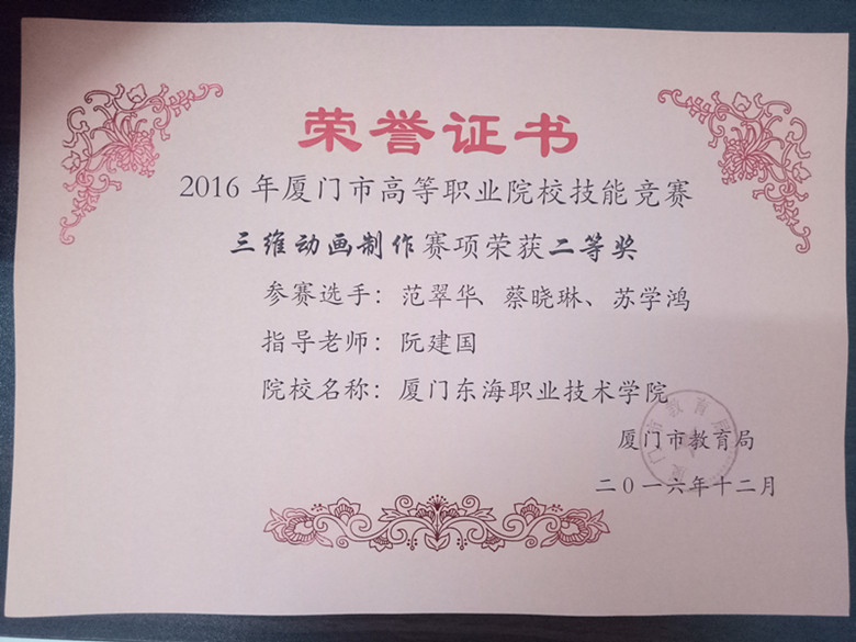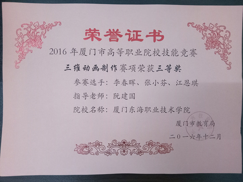 2016年12月,传媒与艺术学院阮建国老师带领两个学生团队参加 “厦门市高等职业院校技能竞赛”,两个团队分别荣获“三维动画组二等奖”和“三维动画组三等奖”。新葡的京官网对阮建国、范翠华、蔡晓琳、苏学鸿、李春晖、张小芬、江恩琪等7位获奖师生给予表扬。