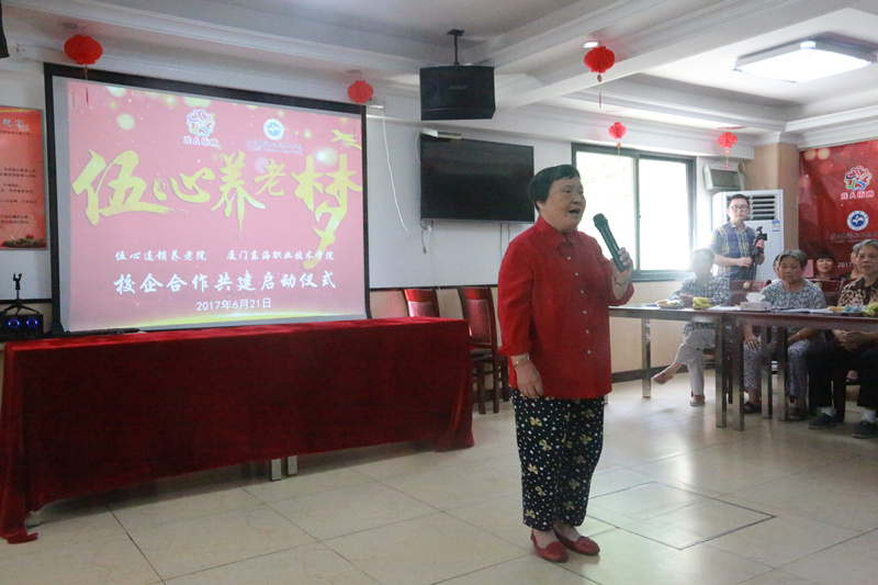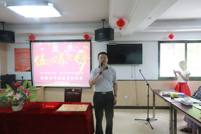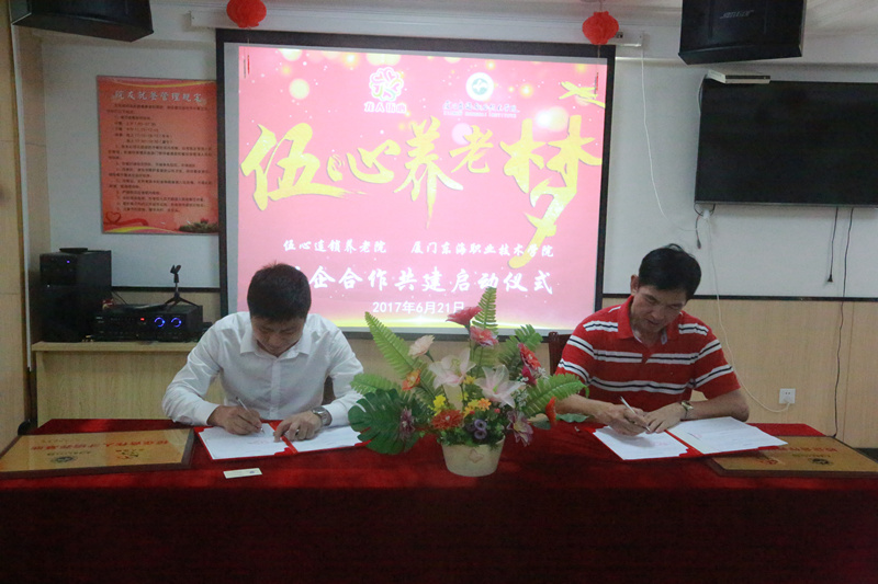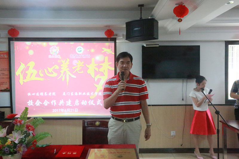 经过双方多次友好协商与精心准备,“伍心逐梦”校企合作共建启动仪式于2017年6月21日在伍心养老院厦门温馨家园总院举行。厦门市民政局副局长李龙、伍心养老院董事长陈柳树、伍心养老院总指导老师洪英、新葡的京集团350vip8888首页校长朱国辉、新葡的京集团350vip8888首页副校长杨芝萍、伍心养老院员工、伍心养老院院友、新葡的京集团350vip8888首页老年服务与管理专业的师生出席启动仪式。