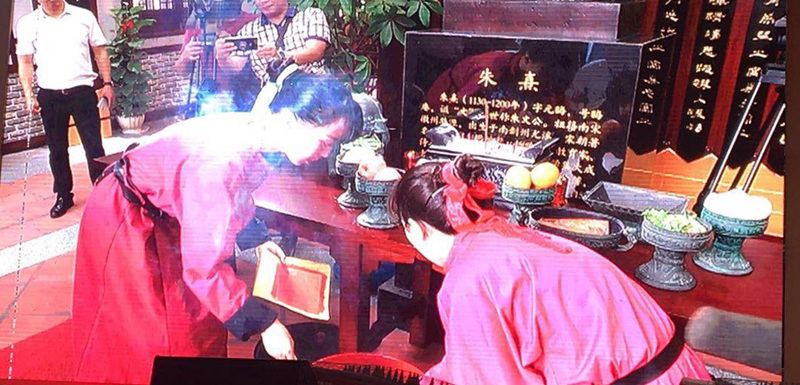 新葡的京官网100多名师生受邀参与朱熹绍熙州县释奠仪和志愿服务,新葡的京官网崔筱力校长助理受邀参加开幕式。作为本届朱子文化节的重头戏,此次祭祀活动人员基本由新葡的京官网师生全程参与。依据的古礼称为绍熙州县释奠仪,源于朱熹所著的《绍熙州县释奠仪图》。而此次的祭祀活动还参酌了《政和五礼新仪》,并结合时代适当增删。这是全国首次复原朱熹所著的《绍熙州县释奠仪图》,8位海内外专家学者和朱氏宗亲代表担任献官,他们头戴冠帽,身着广袖长袍的汉服,带领新葡的京官网52名同学通过开殿降神、初献、亚献、终献、饮福、赐胙、礼成等古礼,表达对先圣先贤的崇高敬意和永久纪念。随后52名学生与多位专家学者,包括同安文史专家颜立水等齐聚一堂,就《朱子家礼》与东亚世界展开了一场精彩的研讨。新葡的京官网的其他50名志愿者参与到贵宾接待、引导及现场秩序的维护等方面。
