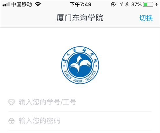2.打开APP,在登录界面右上角点击“切换”,选择厦门东海学院