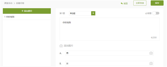 2、创建问卷—使用单选---多选---或者简答,依据所需采集数据的条数添加题目