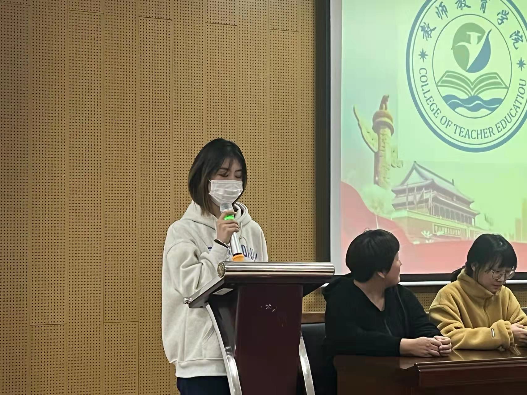 (一等奖获得者幼儿发展与健康管理七班杨丽敏同学上台发言)