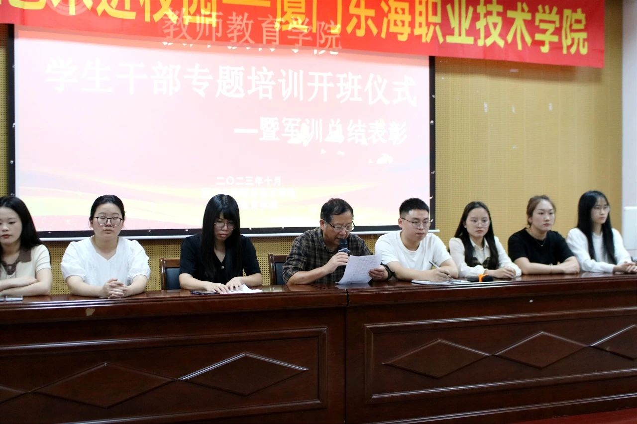 2023年10月30日,我院在思源楼报告厅开展第二届学生干部系列专题培训开班仪式暨军训总结表彰。出席本次大会的领导老师有教师教育学院院长施茂枝教授、教师教育学院院长助理兼第十一党支部书记曾丽燕老师、学生工作处思想政治教育科老师兼教师教育学院团总支书记洪畅老师、以及辅导员黄丽英、黄小敏、吴月霞、吴奕洁、林紫怡和罗铃老师。