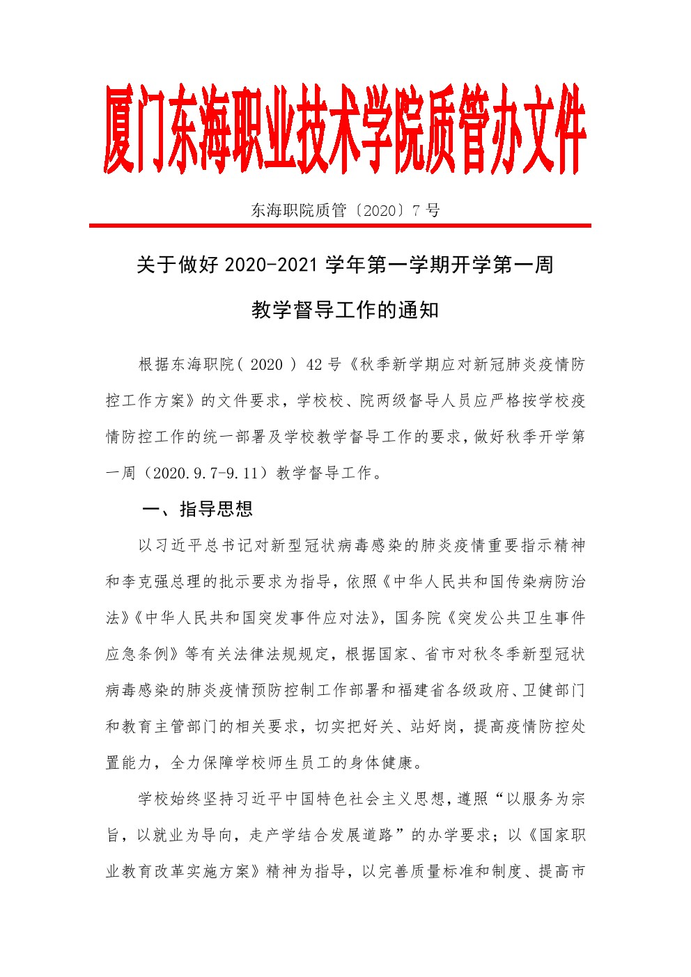 东海职院质管〔2020〕7号 关于做好2020-2021学年第一学期开学第一周教学督导工作的通知