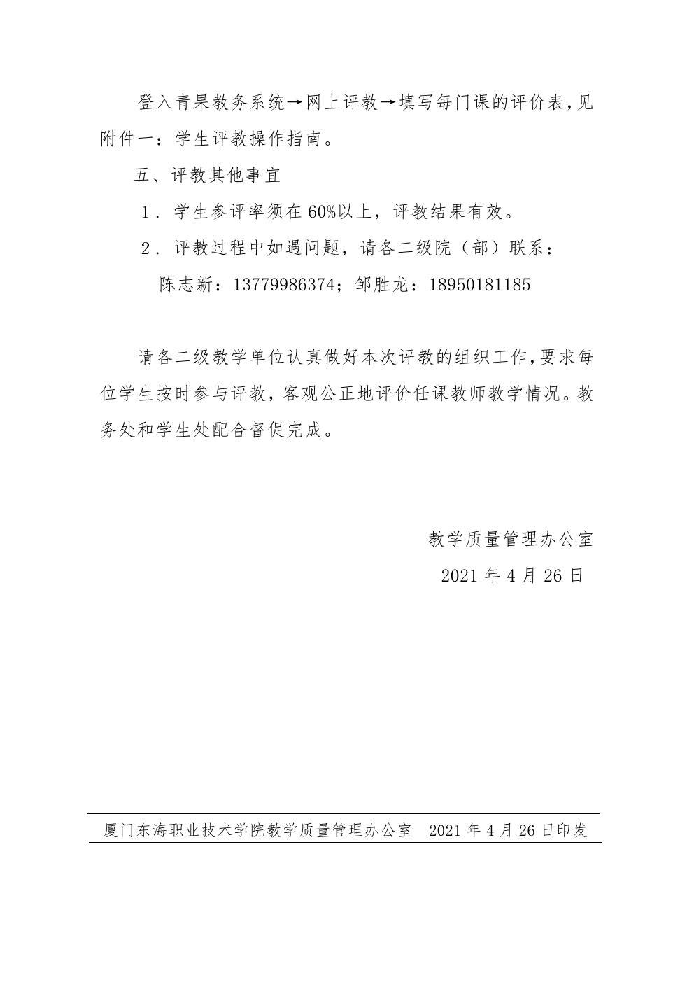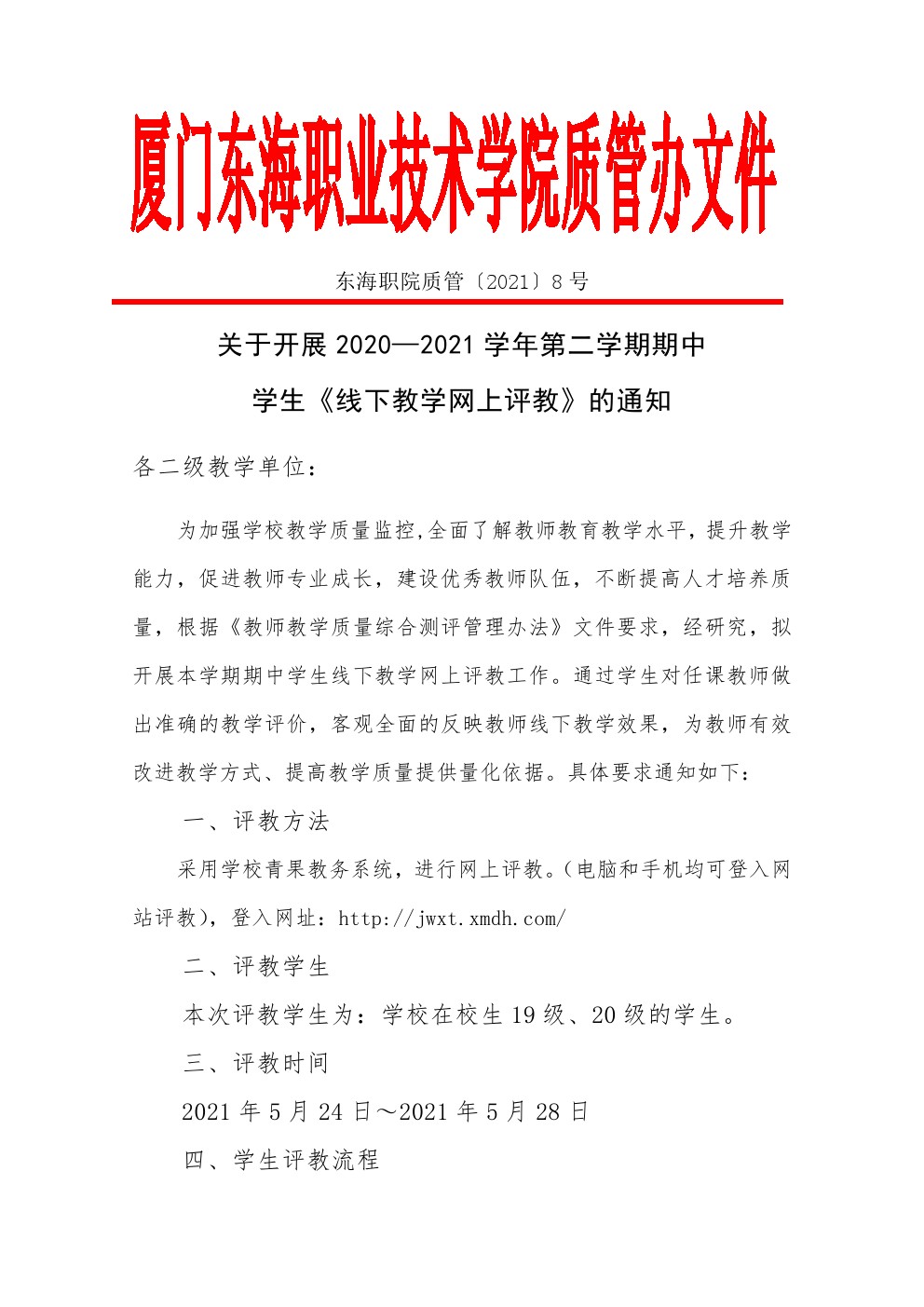 东海职院质管〔2021〕8号 关于开展2020二2021学年第一学期期中学生《线下教学网上评教》的通知