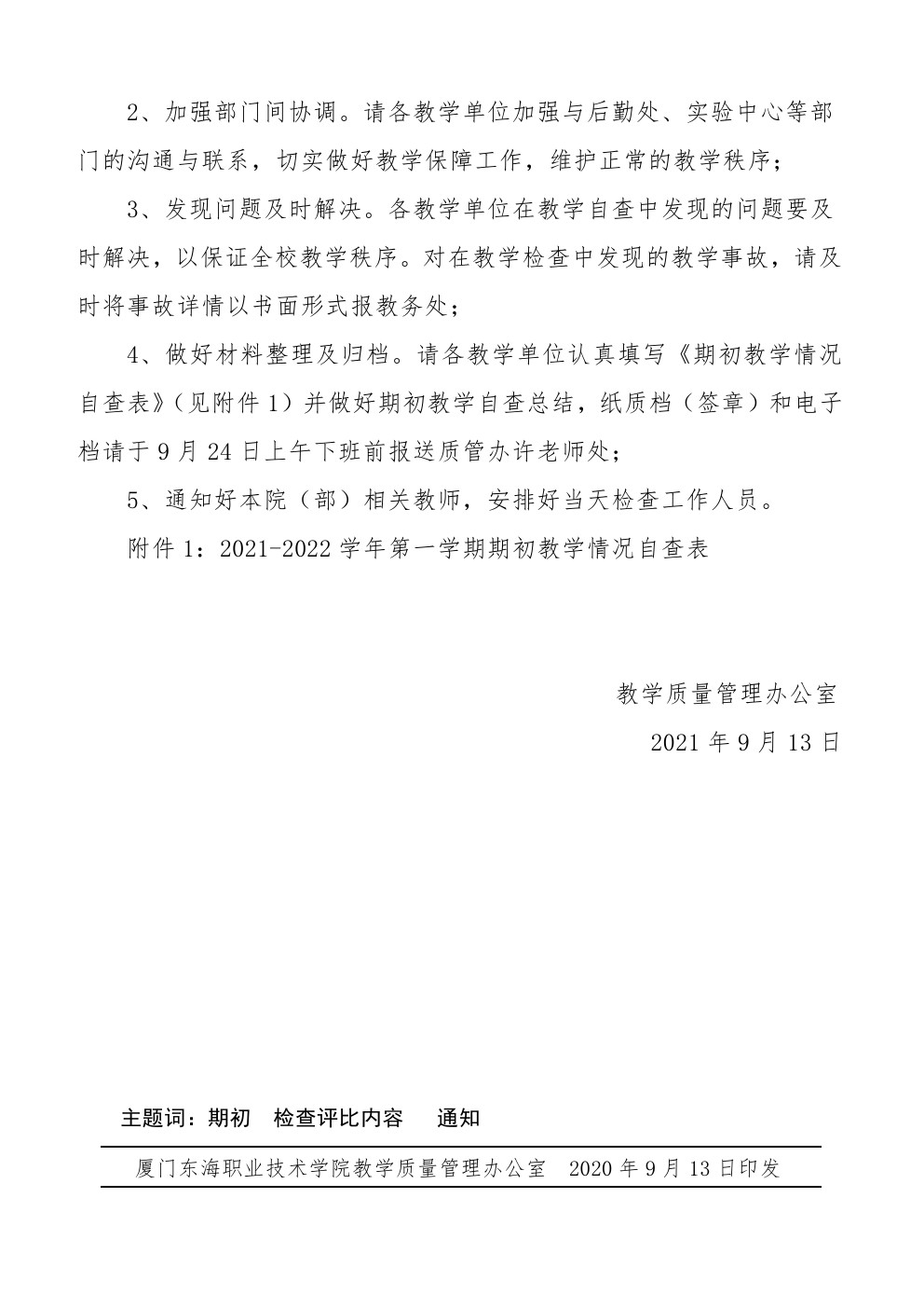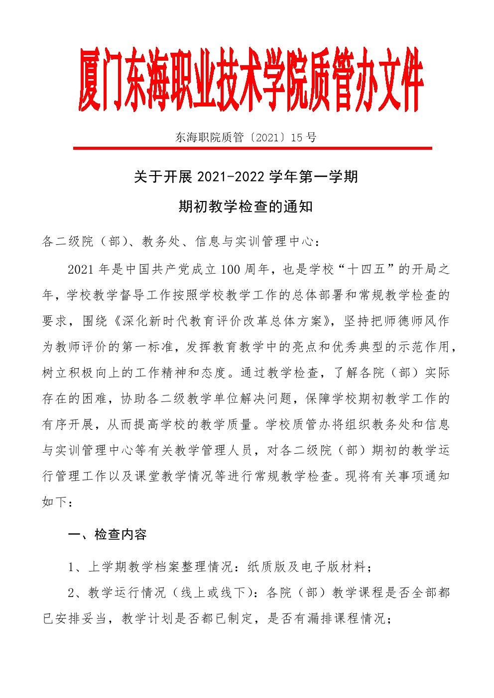 东海职院质管〔2021〕15号 开展2021-2022学年第一学期期初教学检查的通知