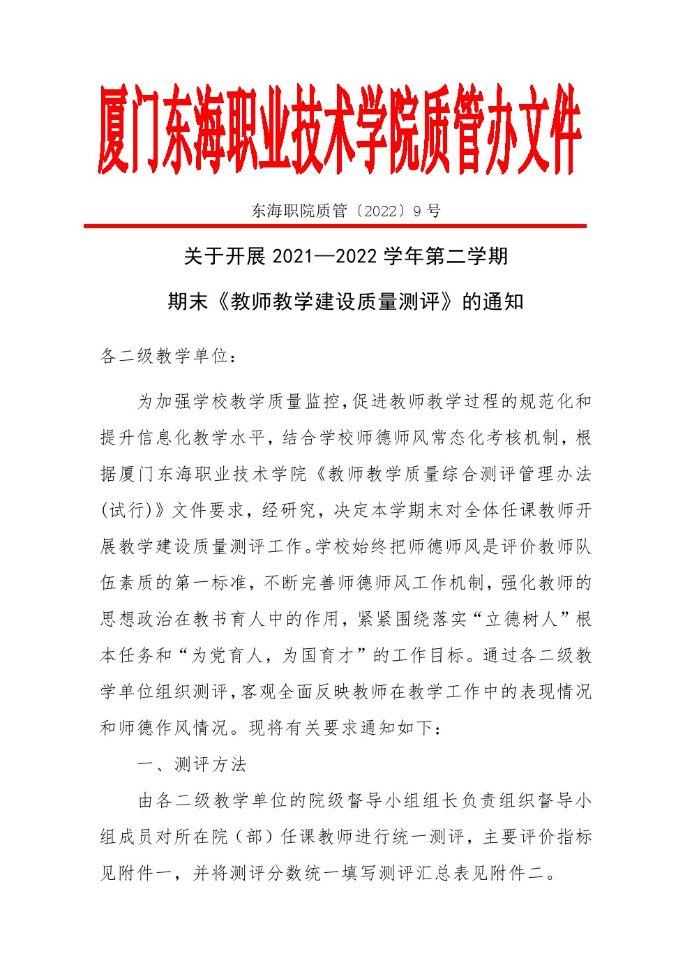 东海职院质管〔2022〕9号 关于开展2021—2022学年第二学期期末《教师教学建设质量测评》的通知