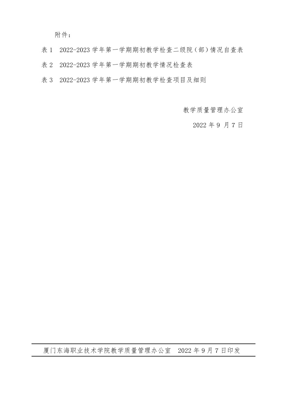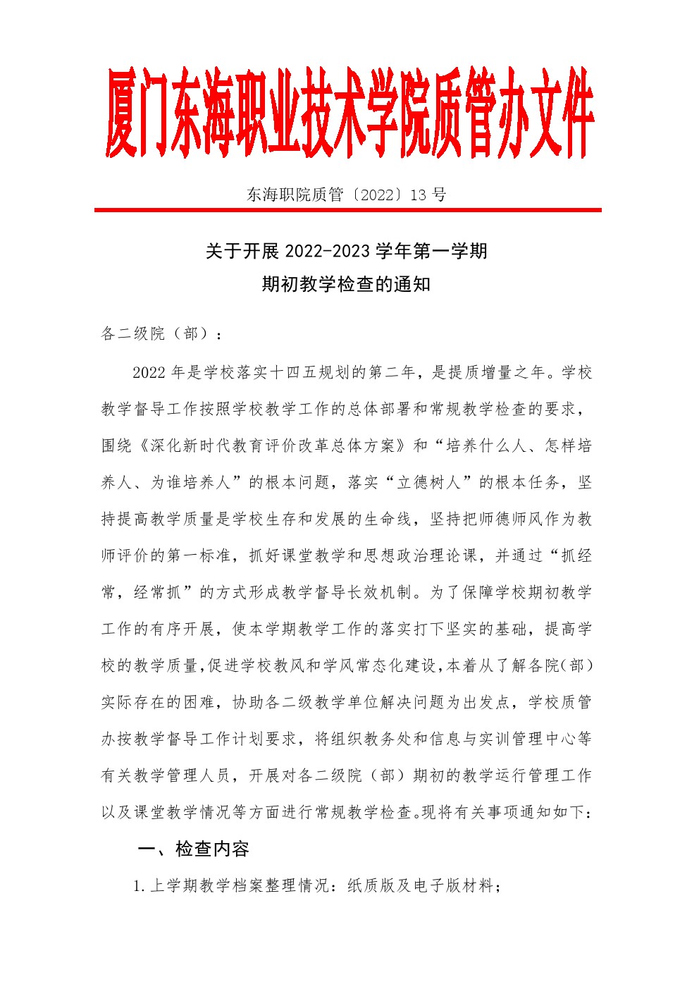 东海职院质管〔2022〕13号 开展2022-2023学年第一学期期初教学检查的通知
