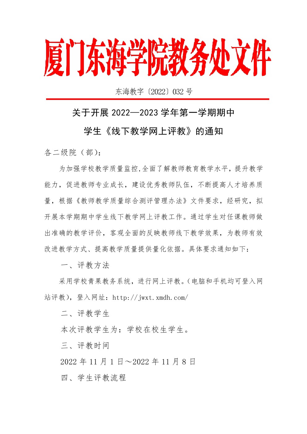 东海教字〔2022〕32号 关于开展2022-2023学年第一学期期中学生《线下教学网上评教》的通知