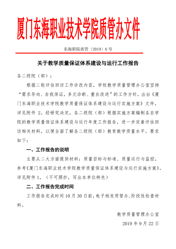 东海职院质管[2019]6号——关于内部质量保证体系建设与运行工作报告