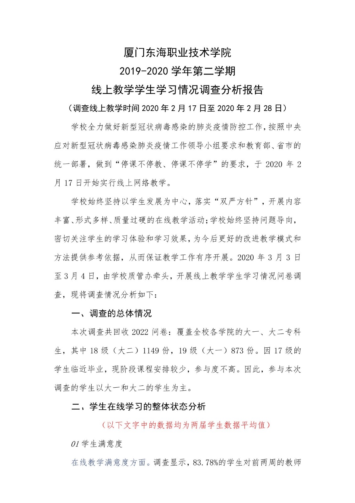 新葡的京集团350vip8888首页开学前二周线上教学学生学习情况分析报告
