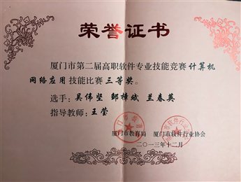 1.2013.12指导学生参加厦门市第二届高职软件专业技能竞赛《计算机网络应用》项目比赛,获得三等奖;