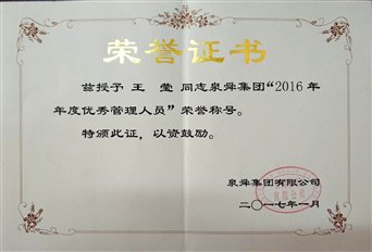 4.2017年1月被泉舜集团评为“2016年度优秀管理人员”;