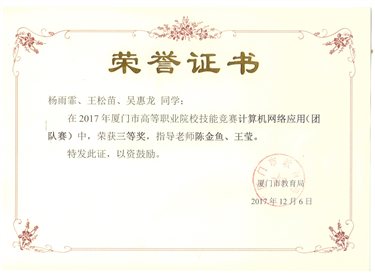 5.2017.12指导学生在2017年厦门市高等职业院校技能竞赛《计算机网络应用(团体赛)》中获得三等奖;