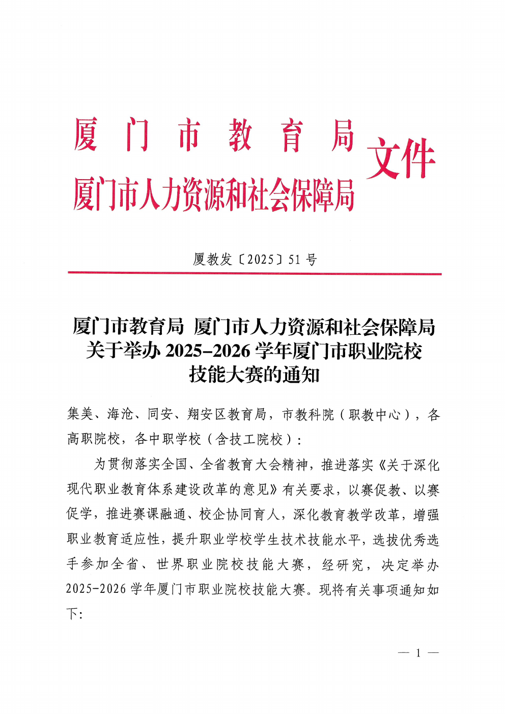 厦教发〔2025〕51号 关于举办 2025-2026学年厦门市职业院校技能大赛的通知.pdf