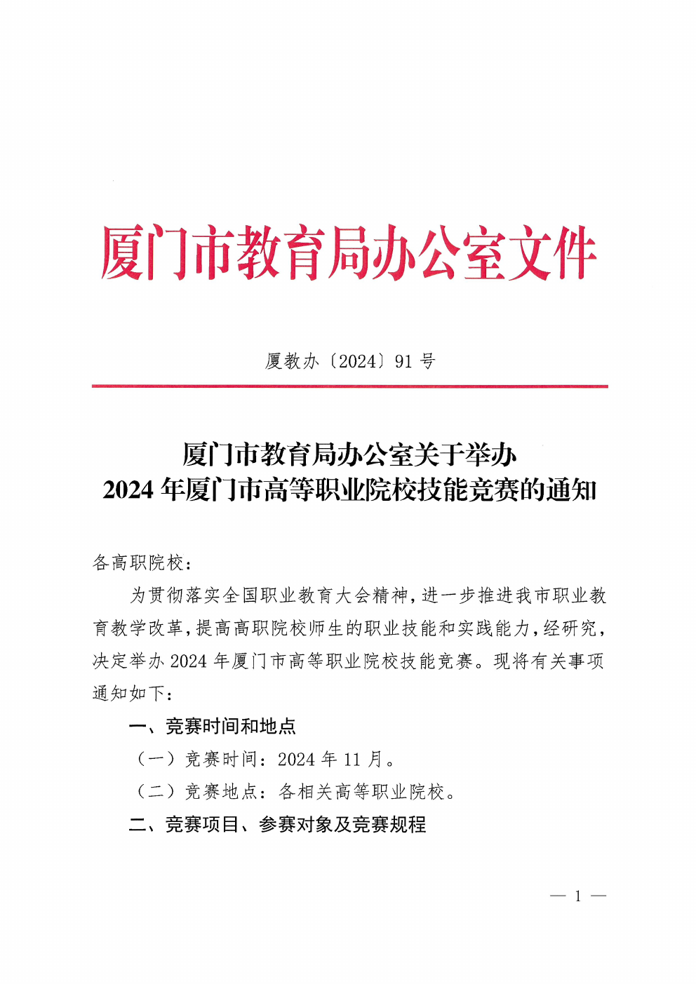 厦教办(2024)91号 关于举办2024年厦门市高等职业院校技能竞赛的通知.pdf