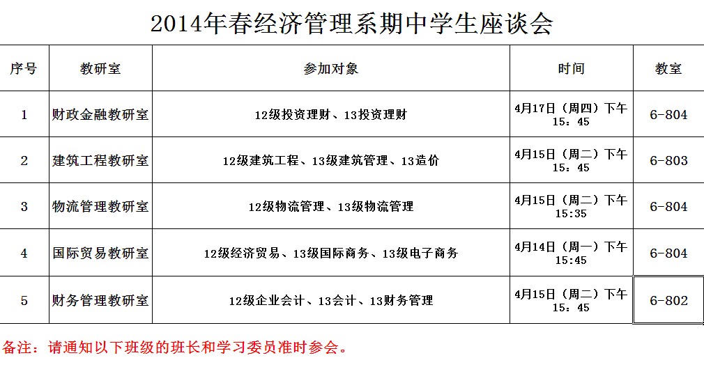 关于举办2014年春经济管理系期中学生座谈会的通知
