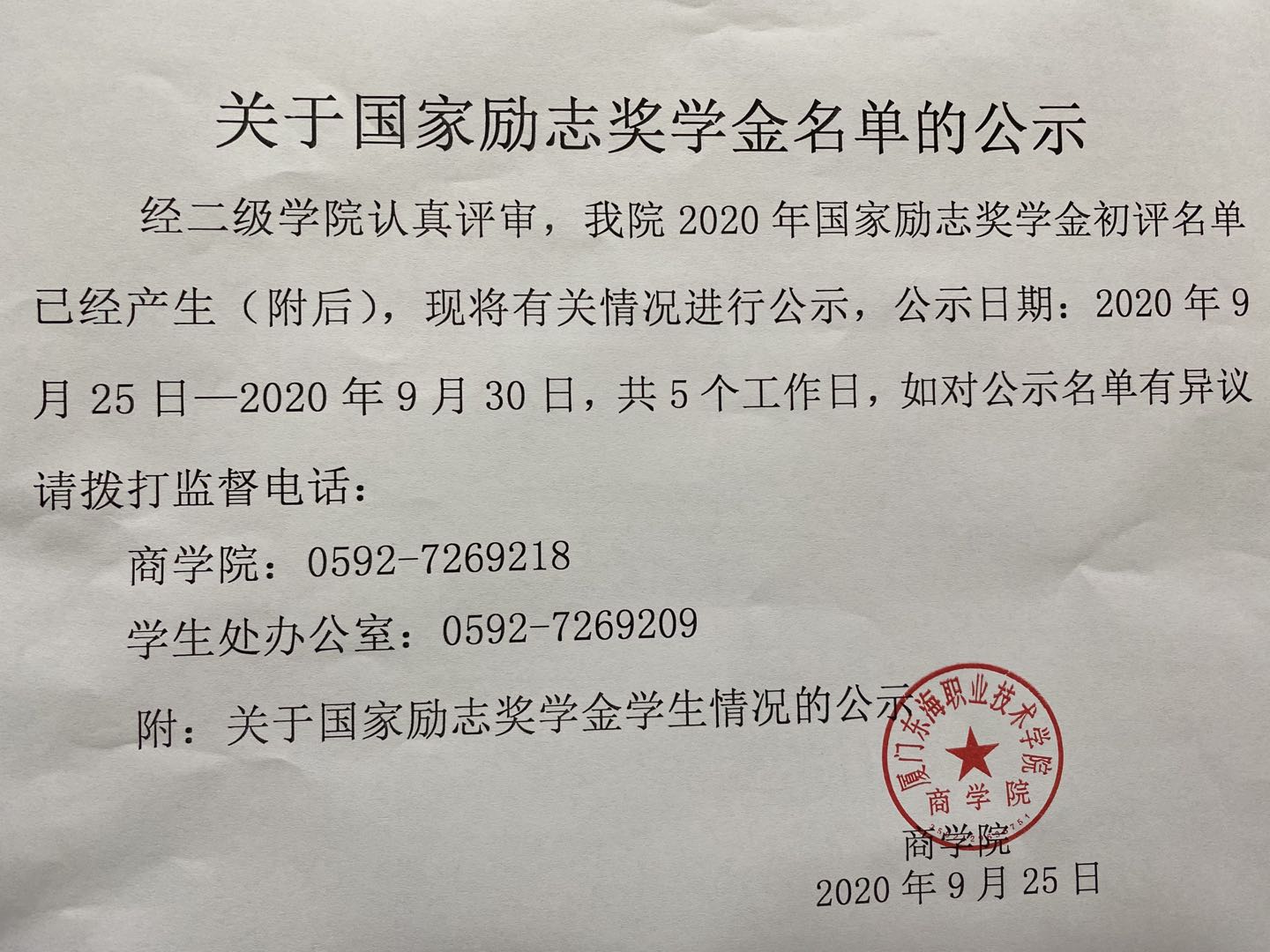 关于国家励志奖学金名单的公示