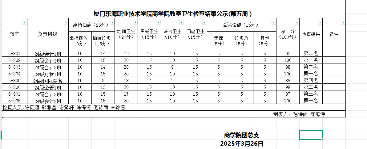2024-2025学年第二学期商学院第5周班级卫生评比