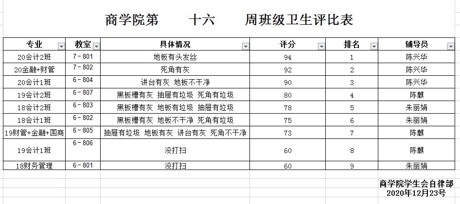 2020-2021年第一学期商学院第十六周班级卫生评比