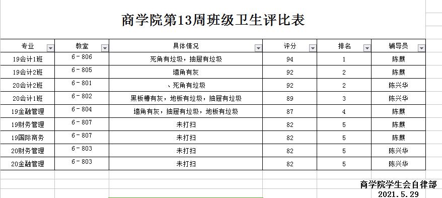 2020-2021年第二学期商学院第十三周班级卫生评比
