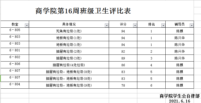 2020-2021年第二学期商学院第十六周班级卫生评比