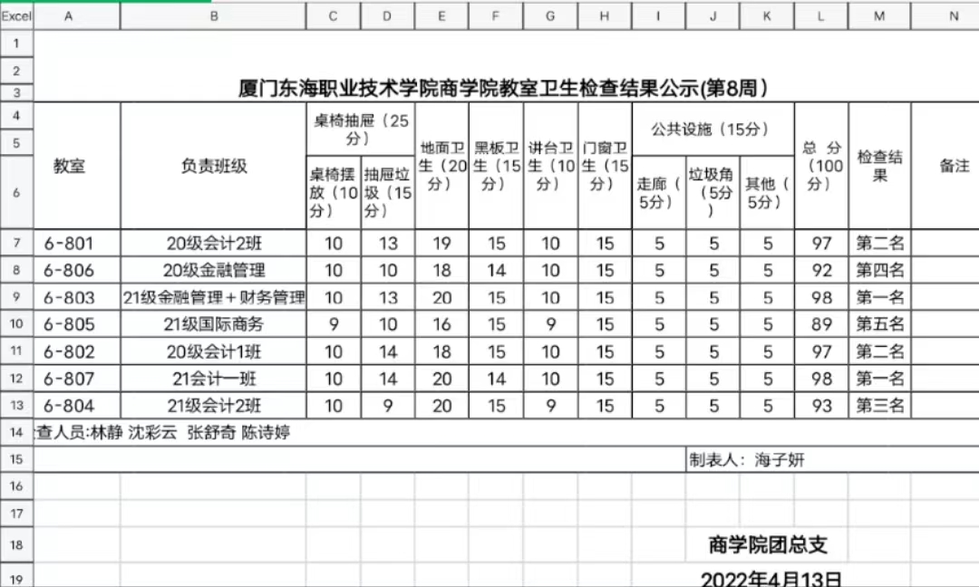 2021-2022年第二学期商学院第八周班级卫生评比