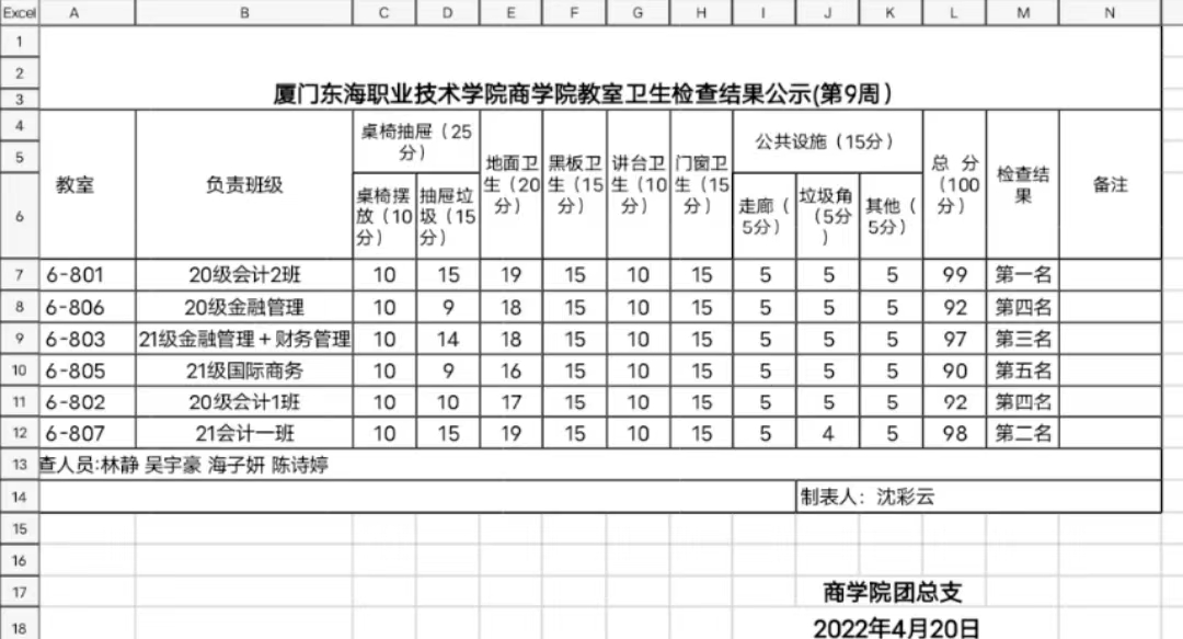 2021-2022年第二学期商学院第八周班级卫生评比