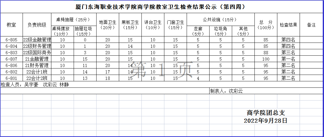 2022-2023学年第一学期商学院第四周班级卫生评比