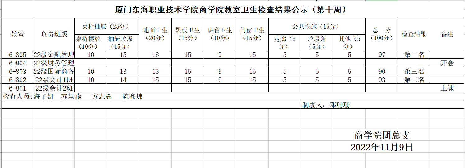 2022-2023学年第一学期商学院第十周班级卫生评比