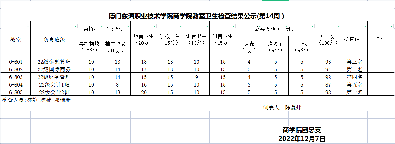 2022-2023学年第一学期商学院第十四周班级卫生评比