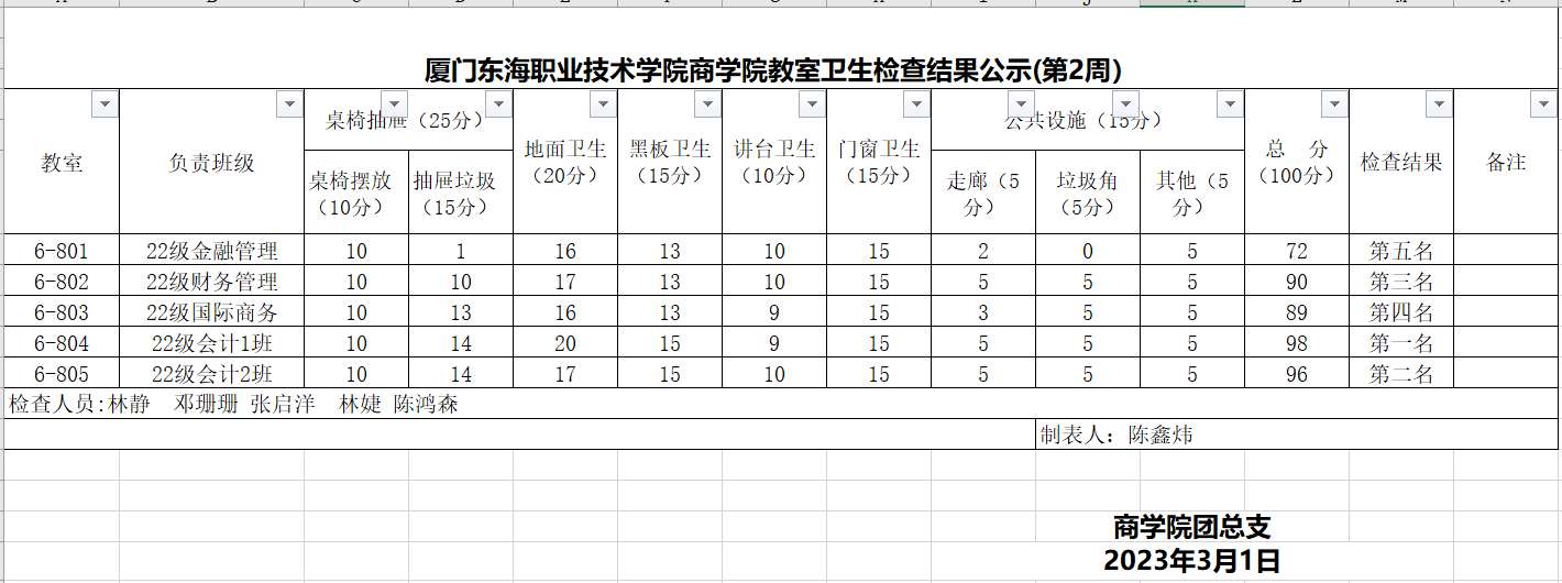 2022-2023学年第二学期商学院第3周班级卫生评比