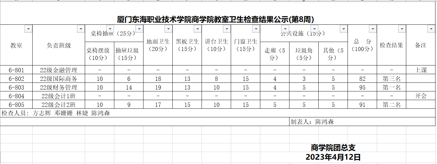 2022-2023学年第二学期商学院第8周班级卫生评比