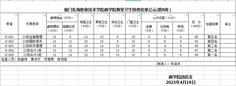 2022-2023学年第二学期商学院第9周班级卫生评比