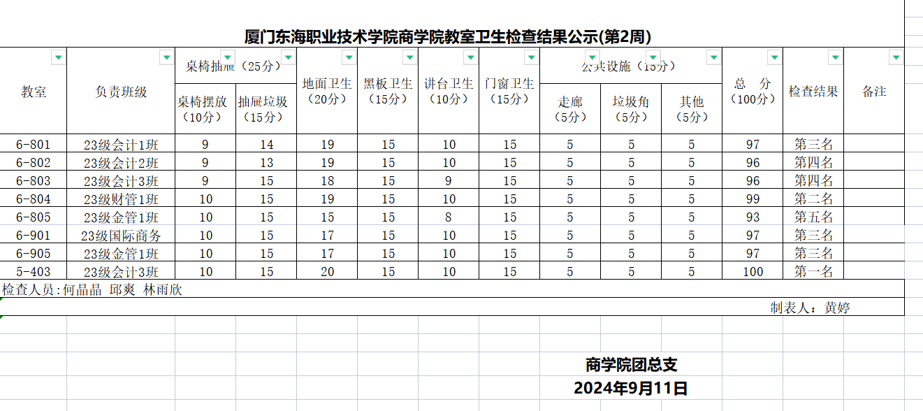 2024-2025学年第一学期商学院第2周班级卫生评比
