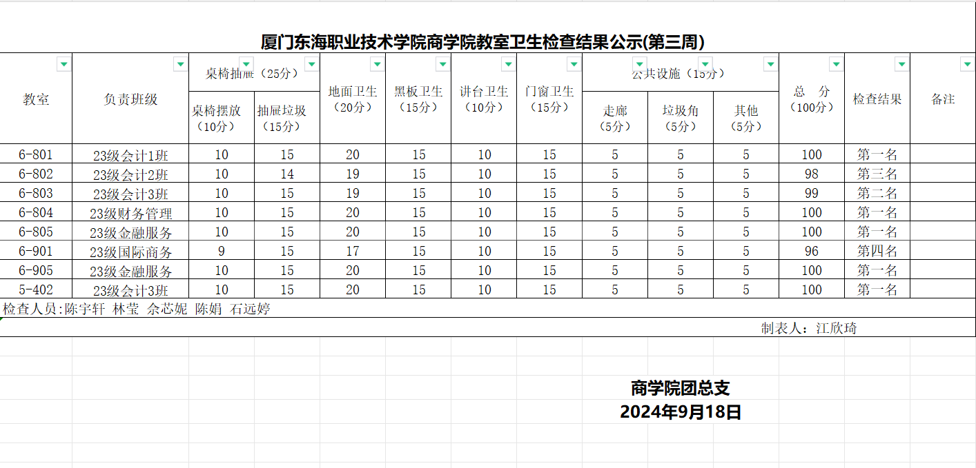 2024-2025学年第一学期商学院第3周班级卫生评比
