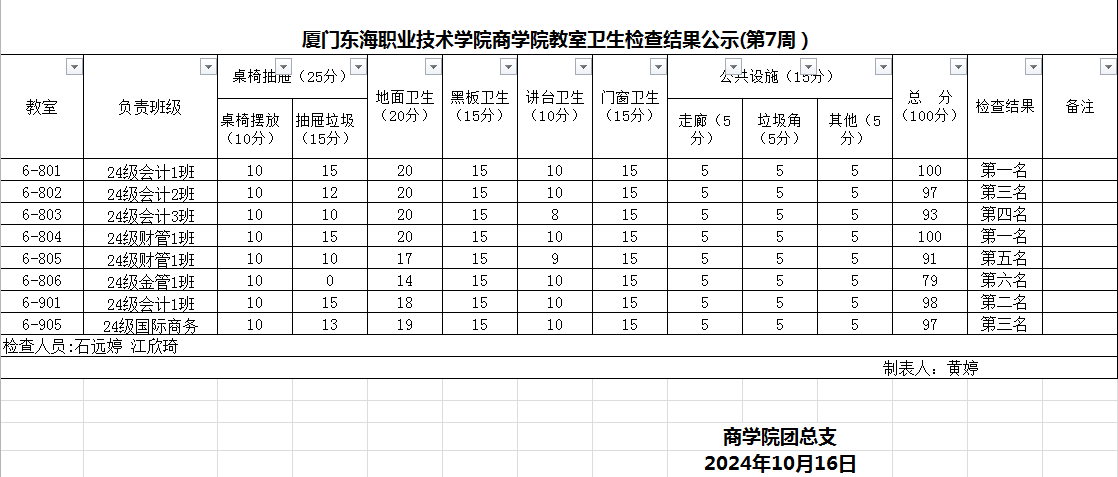 2024-2025学年第一学期商学院第6周班级卫生评比