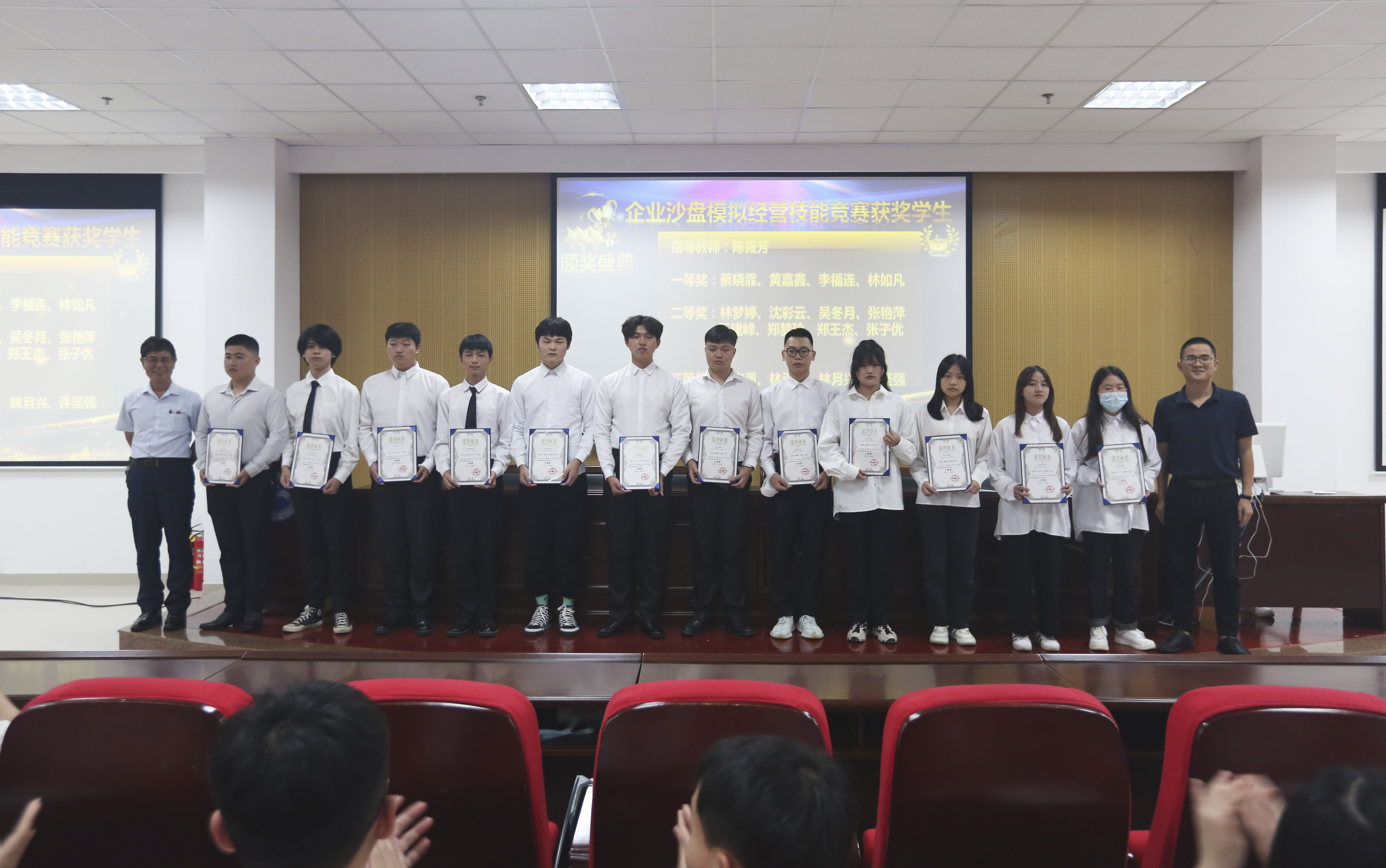 颁奖仪式上对“会计现在 财赢未来”会计技能竞赛、“金戈铁马 熔古铸今”银行业务技能竞赛和“驰骋‘沙’场,谁与争‘盘’”企业沙盘模拟经营技能竞赛,以及“赢在智者,唯我销雄”市场营销技能大赛共88名获奖学生颁发证书、礼品。