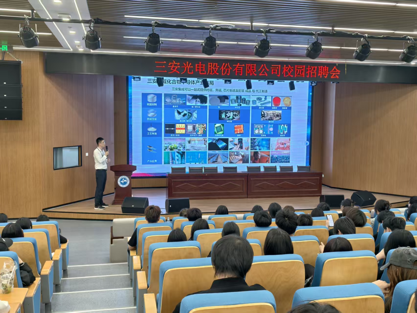 招聘会上,三安光电人力资源负责人通过企业宣传片、PPT讲解等方式,向在场学生详细介绍了公司的发展历程、产业布局及未来规划。作为国家发改委批准的“国家高技术产业化示范工程”企业,三安光电在LED外延片、芯片等领域占据领先地位,并在厦门、芜湖、泉州等地设有产业化基地。此次招聘会提供了涵盖、生产类、设备类等多个岗位,包括技术员、助理工程师、储备干部等。公司特别强调,学生若具备扎实的专业知识、良好的学习能力和团队协作精神,将有机会获得优厚的薪资待遇及完善的职业发展通道。