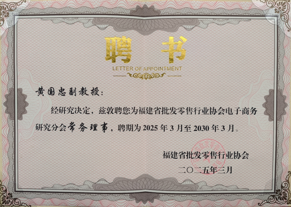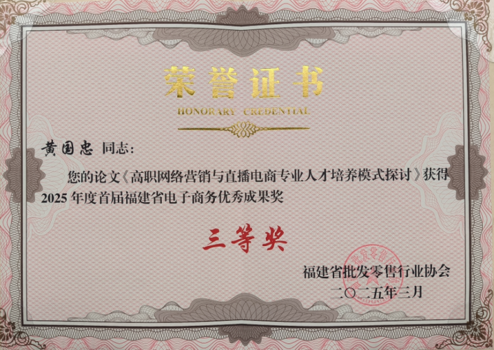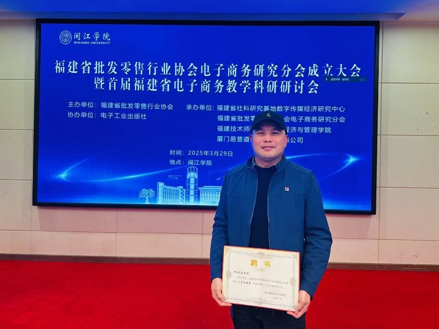 我院对电子商务研究分会的成立高度重视,选派黄国忠老师出席大会。会上,黄国忠当选为福建省批发零售行业协会电子商务研究分会常务理事。同时,在此次研究分会组织开展的“首届福建省电子商务优秀成果奖”评选活动中,黄国忠老师的论文《高职网络营销与直播电商人才培养模式研究探讨》荣获三等奖。