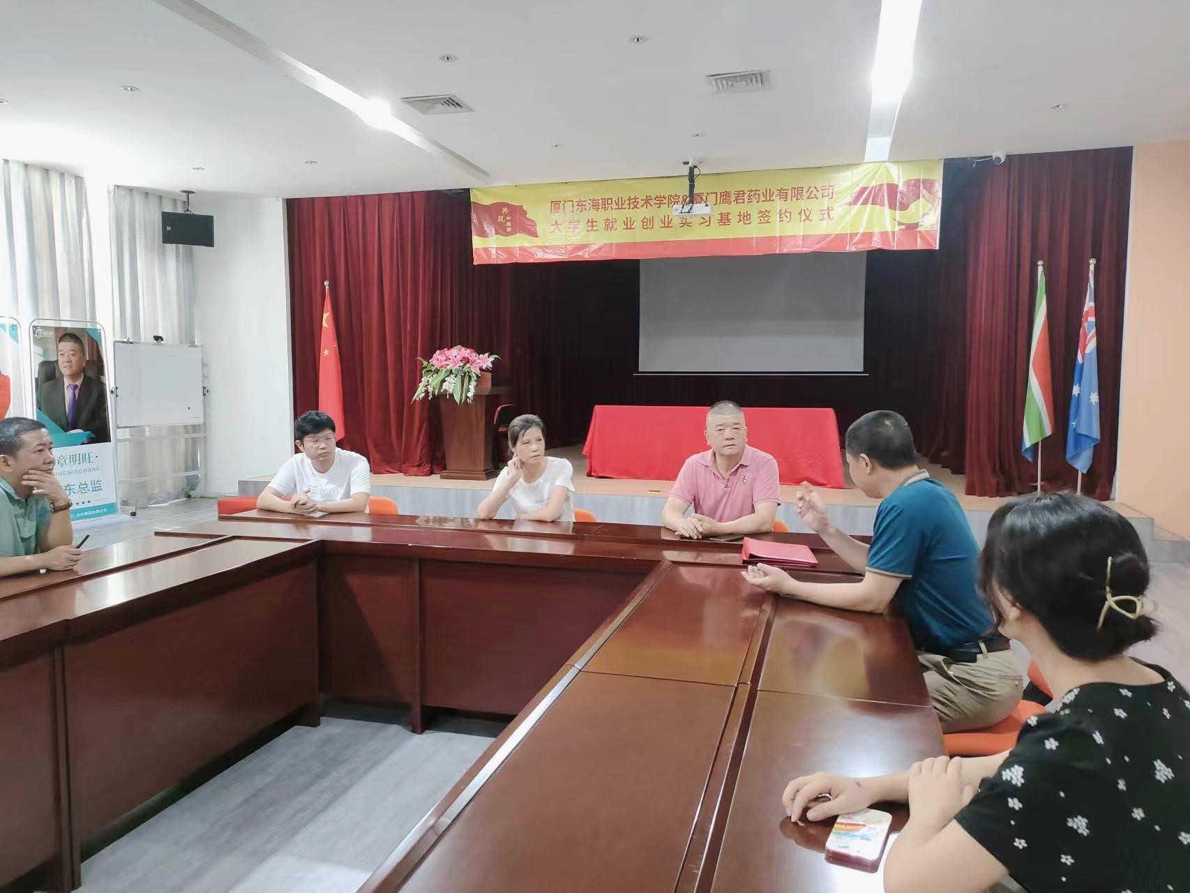 考察交流会上,企业董事长章明旺先生、总经理陈林香女士陪同张清禄院长一行先后考察了公司的生产经营情况和企业的产品展厅。双方就学校向企业输送毕业生,安排学生到企业实习,建立大学生创新就业实习基地等事项进行了深入细致的交流,并签订了新葡的京集团350vip8888首页与厦门鹰君药业有限公司共建“大学生创新就业实习基地”协议书。