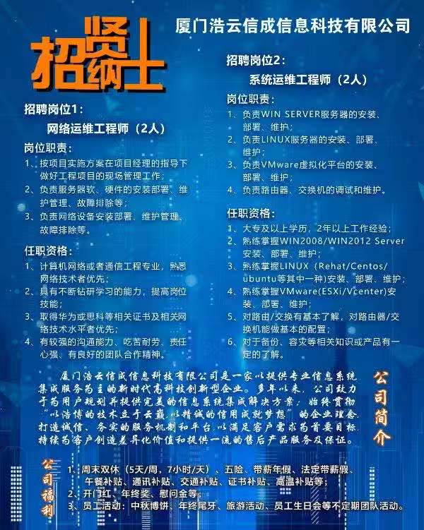 厦门浩云信成信息科技有限公司--招聘信息